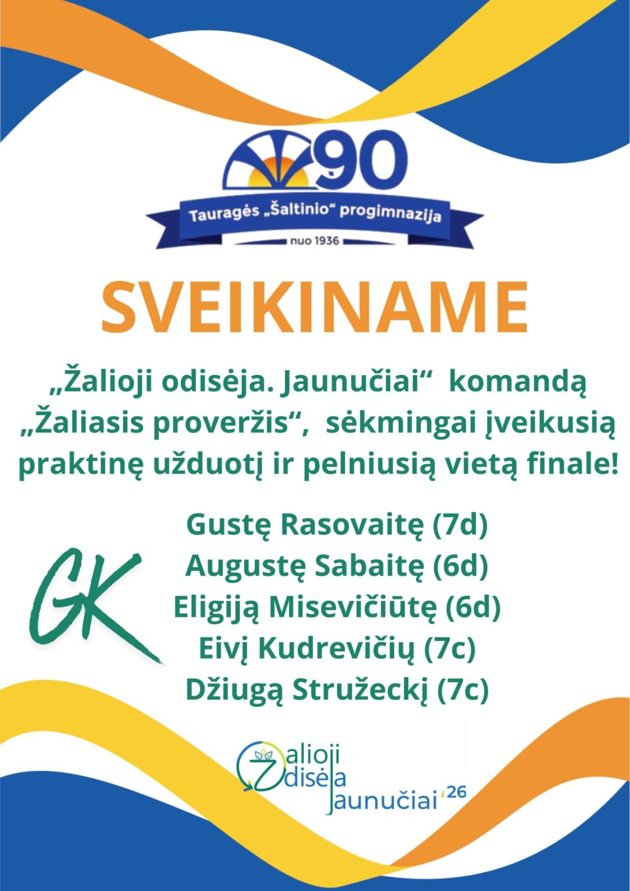 Mūsų mokyklos GK komanda „Žaliasis proveržis“ dalyvauja aplinkosauginiame konkurse „Žalioji odisėja. Jaunučiai ‘26“. Konkurso tikslas – ugdyti mokinių aplinkosauginį sąmoningumą, ypatingą dėmesį skiriant pakuočių inovacijoms ir tvariems sprendimams. Dalyviai gilina ekologines žinias, stiprina praktinius įgūdžius bei mokosi atsakingai tvarkyti pakuočių atliekas, tausoti išteklius ir prisidėti prie aplinkos kokybės gerinimo. Komanda sėkmingai atliko praktinę užduotį ir pateko į finalą!